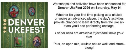 Ukefest 2026 at Swallow Hill Music is coming up Saturday, May 9, 2026. Volunteers from the DUC will be performing 2 songs before the Ukefest evening headliner appears. Here's a link to last year's Denver Uke Community performance at Ukefest 2025. UkeFest Video 2025